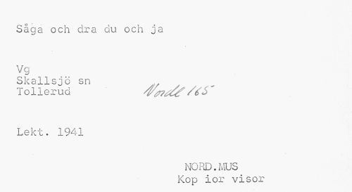 //// Såga och dra du och ja //// # //// Vg //// Skallsjö sn //// Tolleruö US ' //// Lekt. 1941 //// NORD.MUS Kop ior visor ////