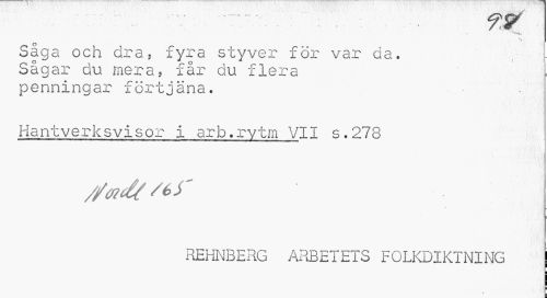 //// Såga och dra, fyra styver för var da. Sagar du mera, får du flera penningar förtjäna. //// Hantverksvisor i arb.rvtm VII s.278 //// //02&/6S' //// REHNBERG ARBETETS FOLKDIKTNING //// ¦ //// t _ //// ¦ ////