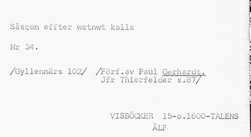//// I //// ¦ //// Såszom effter v/atnwt kalla //// Nr 34. ; //// i ¦ ¦ //// i //// /Gyllenmärs 102/ /Förf.av Paul Gerhardt? ; //// Jfr Thierfelder s.87/ , //// ¦ //// ¦ //// i //// VISBÖCKER 15-o.1600-TALENS //// ALF ////