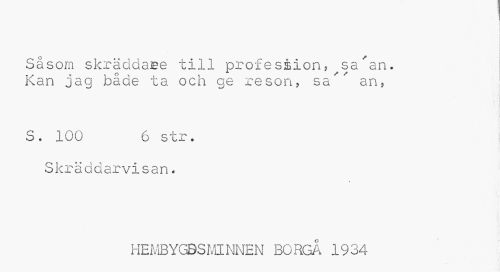 //// ] //// Såsom skräddaee till profession, sa'an. Kan jag både ta och ge reson, sa" an, //// S. 100 6 str. //// Skräddarvisan. //// » //// HEMBYGBSMINNEN BORGÅ 1934 ////