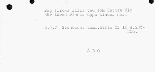 //// ^^ Säg flicka lilla vad som fattas dig. //// när tåren rinner uppä kinder ner, //// 6:4-.? Svenssons saml.häfte Nr 16 s.235- //// 236. //// ÅBO ////