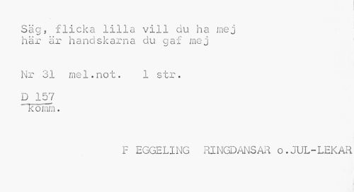 //// Säg, flicka lilla vill du ha mej här är handskarna du gaf mej //// Nr 31 mel.not. 1 str. D 157 //// F EGGEL1NG RINGDANSAR o.JUL-LEKAR ////
