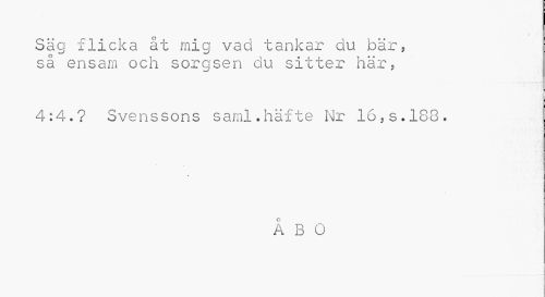 //// Säg flicka åt mig vad tankar du bär, så ensam och sorgsen du sitter här, //// 4:4.? Svenssons saml.häfte Nr 16,s.188. //// ÅBO ////