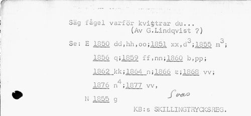 //// e-S //// ¦ I . * * « - . //// " . * •m m- ——^ r - - «---* - * , //// Säg fågel varför kvittrar du... //// (Av G.Lindqvist ?) //// Se: E 1850 dd,hh,oo;1851 xx,dd;1855 //// 1856 q;1859 ff,nn;186Q bspp; //// 1862 kk;1864 n;1866 2;1868 vv, //// 1876 n4;1877 vv5 //// m**m>*mmi*t,tm nwernm r mm mmmnmmmm m—u —— //// ^ N 1855 g J //// KB:s SKILLINGTRYCKSREG. ////