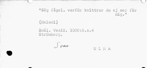 //// uSäg fågel, varför kvittrar du ej mer för //// mig." //// (Melodi) //// Smål. Vexiö, 2308:6,s»4 Strömberg, //// ^ U L M A ////