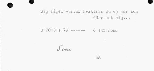 //// Säg fågel varför kvittrar du ej mer som //// förr mot mig... //// B 70:3,s.79 --- 6 str.kom. //// RA ////