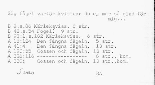 //// Säg fågel varför kvittrar du ej mer så glad för //// mig. . . //// B 8,s.86 Kärleksvisa. 6 str. //// B 48,s.54 Fogel9 str. , j //// B 98:l,s.l02 Kärleksvisa. 6 str. j //// A 16:124 Den fångna fågeln. 5 str. ; //// A 41:4 Den fangna fågeln. 13 str. A 190:55 Gossen och fågeln. 13 str. //// A 326:116 ---6 str., kom. //// A 3301/ Gossen och fågeln. 13 str.,kom. : //// J U^O RA ////