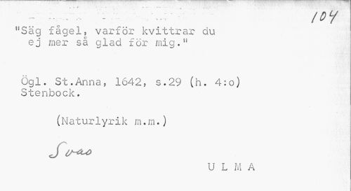 //// - . . , : /DL/ //// nSäg fågel, varför kvittrar du ej mer så glad for mig.11 //// Ögl. St.Anna, 1642, s.29 (h. 4:o) Stenbock. //// (Naturlyrik m.m.) //// J //// U L M A ////