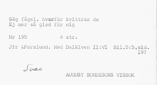 //// Säg fågel, hvarför kvittrar du Ej mer så glad för mig //// Nr 195 4 str. //// Jfr LForslund. Med Dalälven II:VI Bil.5:5,sid. //// 197 //// J //// AUGUST BONDESONS VISBOK ////