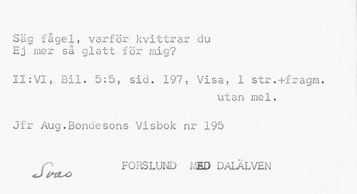 //// Säg fågel, varför kvittrar du Ej mer så glatt för mig? //// II:VI, Bil. 5:5, sid. 197, Visa, 1 str.+fragm. //// » //// utan mel. Jfr Aug.Bondesons Visbok nr 195 //// f FORSLUND MED DALÄLVEN //// <J t*cL<c ////