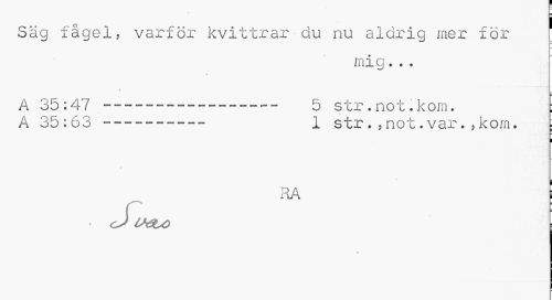 //// Säg fågel, varför kvittrar du nu aldrig mer för ' //// mig... //// ? //// A 35:47 --- 5 str.not.kom. ; //// A 35:63 ---1 strnot .var.,korn. ; //// i //// / //// RA i //// cJ ; ////