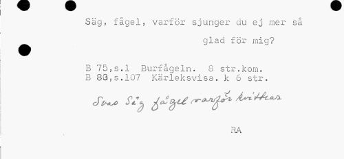 //// Säg, fågel, varför sjunger du ej mer så ^ glad för mig? //// B 75,s.l Burfågeln. 8 str.kom. B 83,s.107 Kärleksvisa. k 6 str. //// Sm /tWVA^ //// RA //// I ////