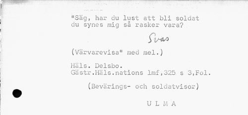 //// r T» —— -fwi-a //// 51 Säg 5 har du lust att bli soldat du synes mig så rasker vara? //// (Värvarevisa" med mel.) Häls. Delsbo. //// Gästr.Hals.nations lmf,325 s 3,Fol. ^^ (Bevärings- och soldatvisor) //// U L M A ////