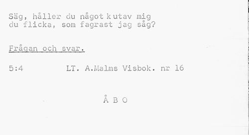 //// Säg, håller du något k utav mig du flicka, som fagrast jag såg? //// Frågan och svar. //// 5:4 LT. A.Malms Visbok, nr 16 //// Å B O ////