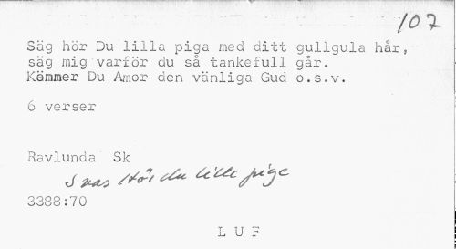 //// • ' ' v ' /Ö % //// Säg hör Du lilla piga med ditt guligula hår> säg mig varför du så tanke-full går. Kommer Du Amor den vänliga Gud o.s.v. //// r i //// 6 verser ; //// Ravlunda Sk 3388:70 //// | //// L U F | //// I ////