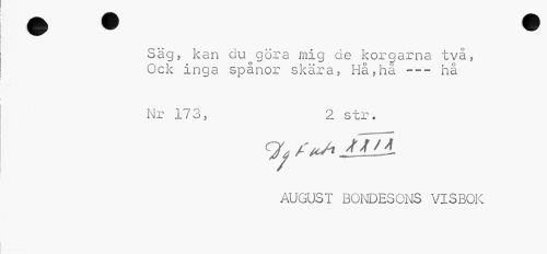 //// Sägs kan du göra mig de korgarna två, Ock inga spånor skära, Hå,hå --- hå //// Nr 173, 2 str. //// JU //// AUGUST BONDESONS VISBOK ////