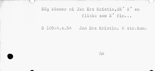 //// — //// i* ' • //// Säg känner ni Jan Ers Kristin,dä' ä' en //// flicka som ä' fin... B 105:4,s.54 Jan Ers Kristin. 8 str.kom. ////