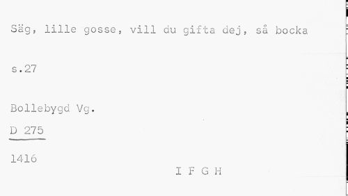 //// I //// Säg, lille gosse, vill du gifta dej, så bocka : //// ¦ //// s. 27 l //// ¦ //// ¦ I //// Bollebygd Vg. ^ //// D 275 : //// 1416 //// I F G H ////