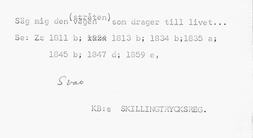 //// ( s ii xx ci t q n) //// Sag mig den vägen 'som drager till livet... Se: Z2 1811 b; iS2£ 1818 b; 1834 b;1835 a; //// 1845 b; 1847 d; 1859 e, //// i> l^o //// \ //// KB:s SKILLINGTRYCKSHEG. ////