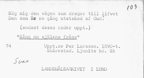 //// /Of //// , Säg mig den vägen som drager till lifvet Den som ärt en gång utstakad af Gud T //// (endast dessa rader uppt.) //// fiSång om själens fråga" //// 74 Uppt.av Per Larsson. 1890-t. //// Snårestad. Ljunits hd. Sk //// L ANDS MÅLS ARKI VE T I LUND ////