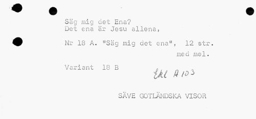 //// Säg mig det Ena? //// Det ena är Jesu allena. //// Nr 18 A. !,Säg mig det ena", 12 str. //// me d me1. //// Variant 18 B //// ikl //// SAVE GOTLÄNDSKA VISOR ////