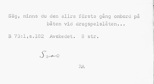 //// I //// Säg, minns du den allra första gång ombord på //// båten vid dragspelslåten... //// i //// B 73:1,s.182 Avskedet. 8 str. //// s i //// i //// RA ////