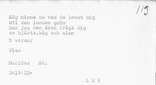 //// Sag minns du vad du lovat mig ; //// uti den lunden grön i //// har jag den äran fråga dig av hjärta,håg och sinn //// 5 verser //// i //// ! //// Visa | //// Har lösa Sk. 3419:22- //// L U F ////
