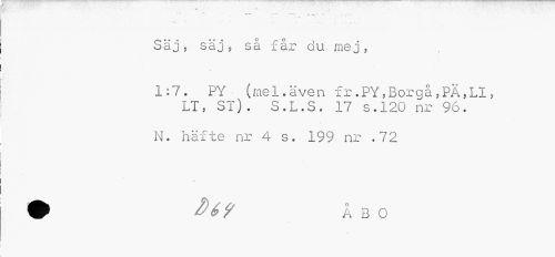 //// Säj; säjs så får du mej, //// 1:7. PY (mel.även fr.PY,Borgå,PÄ,LI, LT, ST). S.L.S. 17 s.120 nr 96. //// N. häfte nr 4 s. 199 nr .72 & VÅBO ////