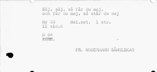 //// C * # O fs O 4f O //// Saj} saj, sa far du mej, och får du mej, så står du dej //// Nr 33 . Mel.not. 1 str. II sid.6 //// D 64 ICoMi. //// PR. NQDERMANN SÅNGLEKAR ////