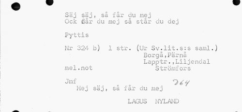//// Säj säj 5 så får du mej //// Ock flår du mej så står du dej //// Pyttis //// Nr 324 b) 1 str. (Ur Sv.lit.s:s saml.) //// Borgå?Pärnå Lapptr..Liljendal me1.no t S trömfor s //// Jmf c Oéy //// Hej säj, sä får du mej //// LAGUS NYLAND ////