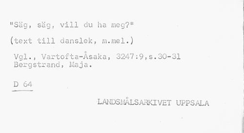 //// "Säg, säg, vill du ha meg?" (text till danslek, m.mel.) //// o //// Vgl., Vartofta-Asaka, 3247:9,s.30-31 Bergstrand, Maj a * //// , <i //// D 64 //// LANDSMÅLSARKIVET UPPSALA //// i //// l ////