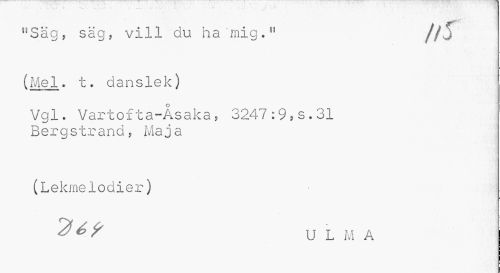//// "Säg, säg, vill du ha mig." //J //// (Mel. t. danslek) //// o //// Vgl. Vartofta-Asaka, 3247:9,s.31 Bergstrand, Maj a //// (Lekmelodier) //// uL MA ////