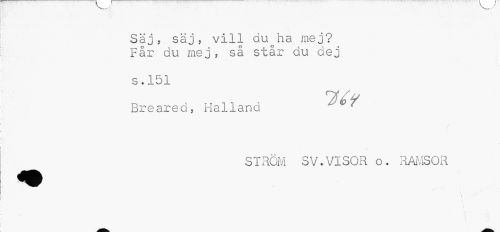 //// Säj, säj, vill du^ha mej? Får du mej, så står du dej //// s. 151 //// nj/y //// Breared, Halland 7 //// STRÖM SV.VISOR o. RAMSOR //// I //// i ////
