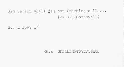 //// Säg varför skall jag som främlingen Ila... //// (Av J.H.Ghronvall) //// O //// Se: E 1899 lö //// 1 I //// KB:s SKILLINGTRYCKSREG. ////