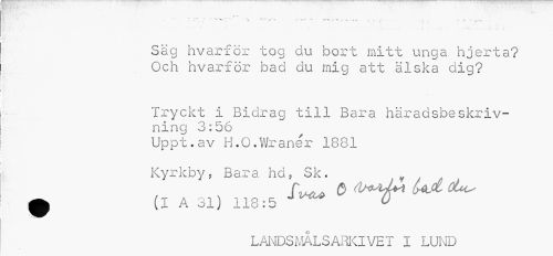 //// K //// ~ " '"* «• •. ". ' -«•«.- -i ..-»...,.. . ¦ . - //// ¦ t c ¦- ... . ~ " //// ' - •• . . .v " .¦ '•». •••..!. //// Säg hvarför tog du bort mitt unga. hjerta? Och hvarför bad du mig att älska dig? //// Tryckt i Bidrag till Bara häradsbeskrivning 3:56 //// Uppt.av H.O.Wranér 1881 Kyrkby. Bara hd, Sk. //// # (I A 31) //// LANDSMÅLSARKIVET I LUND ////