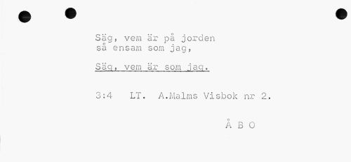 //// Säg, vem är på jorden så ensam som jag, //// Säg, vem är som jag. //// 3:4 LT. A.Malms Visbok nr 2. //// A B O ////