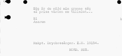 //// Säg är du nöjd min granne säg så prisa värden nu tillslut.T. //// Asarum //// Mskpt. Dryckessånger. E.U. 19154. //// NORD. MUS. ////