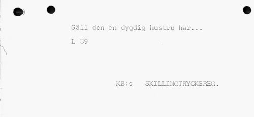 //// Säll den en dygdig hustru har... L 39 //// \ //// KB:s SKILLINGTRYCKSREG. ////