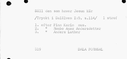 //// Säll den som haver Jesum kär //// /Tryckt i Dalälven 1:5, s.114/ 1 strof //// 1. efter Finn Karin mus. //// 2. " Rombo Anna Ändersdotter //// 3. n Anders Luther //// 319 DALA FORNSAL ////