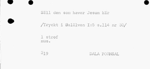 //// Sälj- den som haver Jesum kär //// /Tryckt i Dalälven 1:5 s.114 nr 30/ //// 1 strof rnu s. //// 319 DALA FORNSAL ////