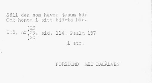 //// Säil den som haver jesum kär Ock honom i sitt hjärta bär. //// (28 //// 1:5, nr(29, sid. 114, Psalm 157 //// (30 //// 1 str. //// » //// i //// FORSLUND MED DALÄLVEN //// i ////