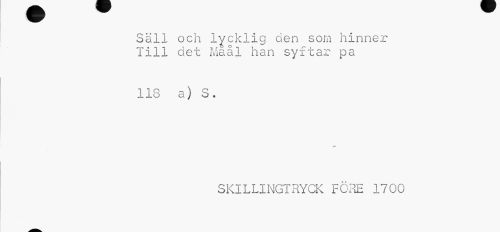 //// Säll och lycklig den som hinner Till det Mäål han syftar pa //// 118 a) S. //// SKlLLINGTRYCK FÖRE 1700 ////