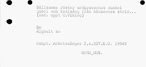 //// Sällsamma röster urkgravarnas dunkel jubel och kvalsång från hänsovnas strid... (not. uppt C.Viking) //// Sm //// * u //// Alghult sn //// Mskpt. Arbetssånger* I,s.227.E.U. 19549 //// NORD MUS. * ////