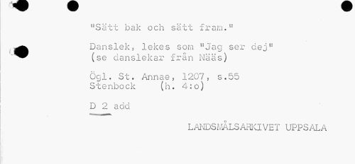 //// "Sätt bak och sätt fram." //// •Danslek, lekes som nJag ser dejn (se danslekar från Nääs) //// Ögl. St. Annae, 1207, s.55 Stenbock (h. 4:o) //// D 2 add //// L ANDS MALS ARKI VET UPP S AL A ////