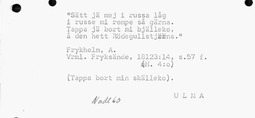 //// nSätt jä mej i russa låg i russe mi rompe så gärna. Tappa jä bort mi bjälleko, å den hett Röaegullstjääna.11 //// Frykholm, A. //// Vrml. Fryksände, 18123:14, s.57 f. //// éH. 4:o) //// (Tappa bort min skälleko). //// u L M A //// > ////