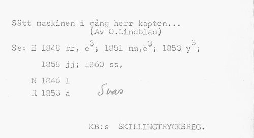 //// Sätt maskinen i gång herr kapten... //// (Av O.Lindblad) //// O O Q //// Se: E 1848 rr, eJ; 1851 mmse; 1853 y°; //// 1858 33; 1860 ss, //// N 1846 1 R 1853 a O //// KB:s SKILLINGTRYCKSREG. ////