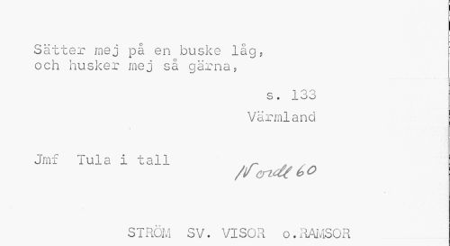 //// Sätter mej på en buske låg, och husker mej så gärna, //// IO A //// OO //// Värmland Jmf Tula i tall ~ //// /fcn^ é>o //// STRÖM SV. VISOR o. RAMSOR ////