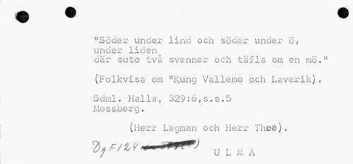 //// "Söder under lind och söder under ö? under liden //// där suto två svenner och täfla om en mö." (Folkvisa om "Kung Vallemo och Laverik). //// SdmI. Malla, 329:6,s.s.5 Mossberg. //// (Herr Lagman och Herr Th©ö) . //// 21, A/i f-u L M A ////