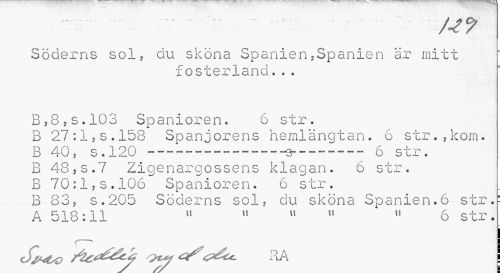 //// Söderns sol, du sköna Spanien,Spanien är rnitt //// fosterland... //// B,85s.103 Spanioren. 6 str. //// B 27:1,s.158 Spanjorens hemlängtan. 6 str.,kom. B 40, s.120 — — ---9--- 6 str. //// B 48,s.7 Zigenargossens klagan. 6 str. B 70:1,s.106 Spanioren. 6 str. //// ___B 83, s.205 Söderns sol, du sköna Spanien.6 str." //// A 518:11 11 u " 11 " 6 str. //// S^vo vy RA ////
