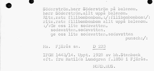 //// Söderström,herr Söderström på balenom, herr Söderström,allt uppå balenom. Rits; ,rats f ilibombombom, :/:f ilibombombom:/: rit^,rate filibombombom allt uppå balenom. :/:Ge oss lite sodavatten, sodavatten,sodavatten, //// ge oss lite sodavatten,sodavatten //// punsch:/: //// Ha. Fjällås sn. D 223 //// IFGH 1443/14. Uppt. 1928 av bh.Stenbock^ ef t. fru iMatilda Lundgren f.1850 i Fjärås. //// NORD.MUS. ////